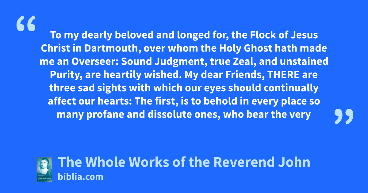 To my dearly beloved and longed for, the Flock of Jesus Christ in Dartmouth, over whom the Holy Ghost hath made me an Overseer: Sound Judgment, true Zeal, and unstained Purity, are heartily wished. My dear Friends, THERE are three sad sights with which our eyes should continually affect our hearts: The first, is to behold in every place so many profane and dissolute ones, who bear the very