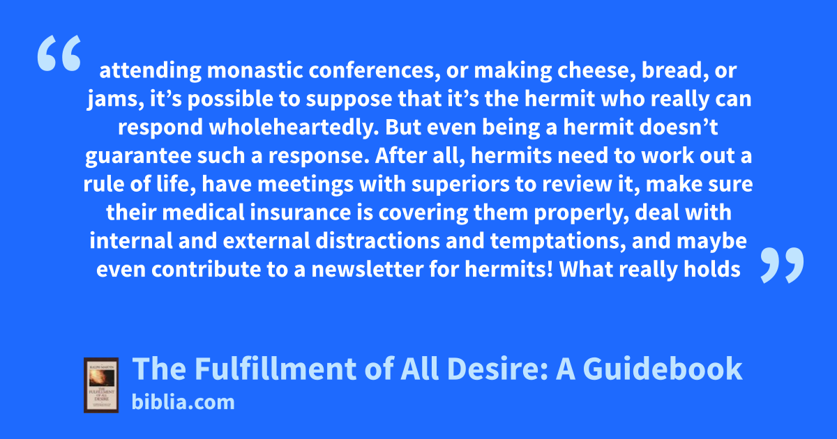 attending monastic conferences, or making cheese, bread, or jams, it’s possible to suppose that it’s the hermit who really can respond wholeheartedly. But even being a hermit doesn’t guarantee such a response. After all, hermits need to work out a rule of life, have meetings with superiors to review it, make sure their medical insurance is covering them properly, deal with internal and external distractions and temptations, and maybe even contribute to a newsletter for hermits! What really holds