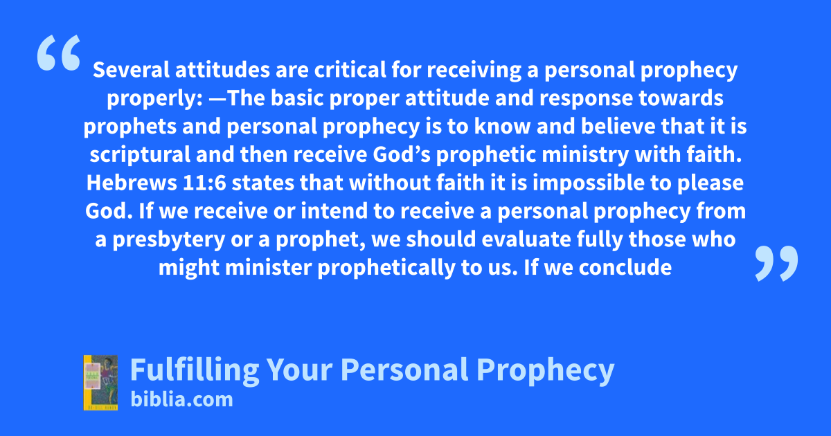 Several attitudes are critical for receiving a personal prophecy properly: —The basic proper attitude and response towards prophets and personal prophecy is to know and believe that it is scriptural and then receive God’s prophetic ministry with faith. Hebrews 11:6 states that without faith it is impossible to please God. If we receive or intend to receive a personal prophecy from a presbytery or a prophet, we should evaluate fully those who might minister prophetically to us. If we conclude