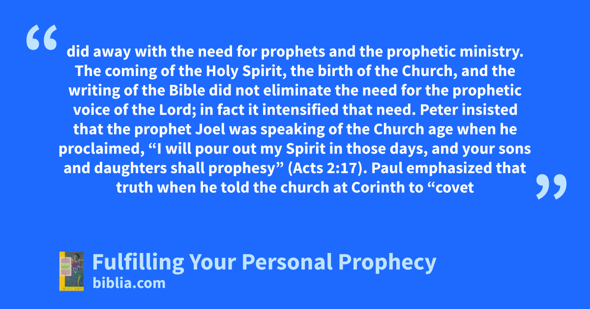 did away with the need for prophets and the prophetic ministry. The coming of the Holy Spirit, the birth of the Church, and the writing of the Bible did not eliminate the need for the prophetic voice of the Lord; in fact it intensified that need. Peter insisted that the prophet Joel was speaking of the Church age when he proclaimed, “I will pour out my Spirit in those days, and your sons and daughters shall prophesy” (Acts 2:17). Paul emphasized that truth when he told the church at Corinth to “covet