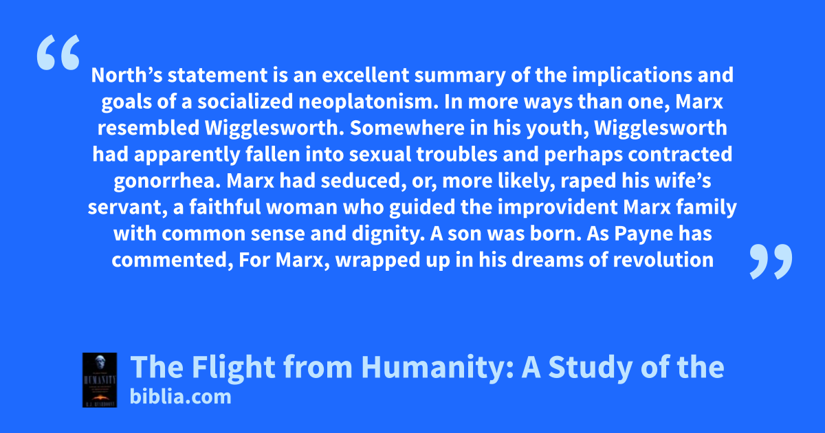 North’s statement is an excellent summary of the implications and goals of a socialized neoplatonism. In more ways than one, Marx resembled Wigglesworth. Somewhere in his youth, Wigglesworth had apparently fallen into sexual troubles and perhaps contracted gonorrhea. Marx had seduced, or, more likely, raped his wife’s servant, a faithful woman who guided the improvident Marx family with common sense and dignity. A son was born. As Payne has commented, For Marx, wrapped up in his dreams of revolution