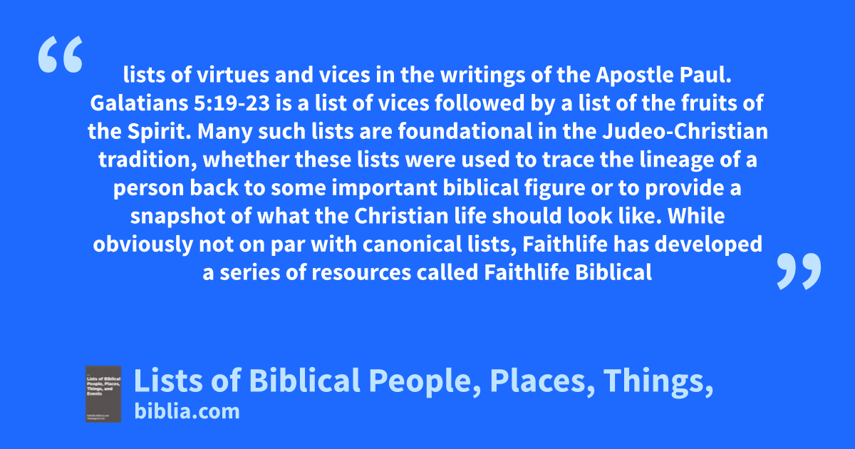 lists of virtues and vices in the writings of the Apostle Paul. Galatians 5:19-23 is a list of vices followed by a list of the fruits of the Spirit. Many such lists are foundational in the Judeo-Christian tradition, whether these lists were used to trace the lineage of a person back to some important biblical figure or to provide a snapshot of what the Christian life should look like. While obviously not on par with canonical lists, Faithlife has developed a series of resources called Faithlife Biblical