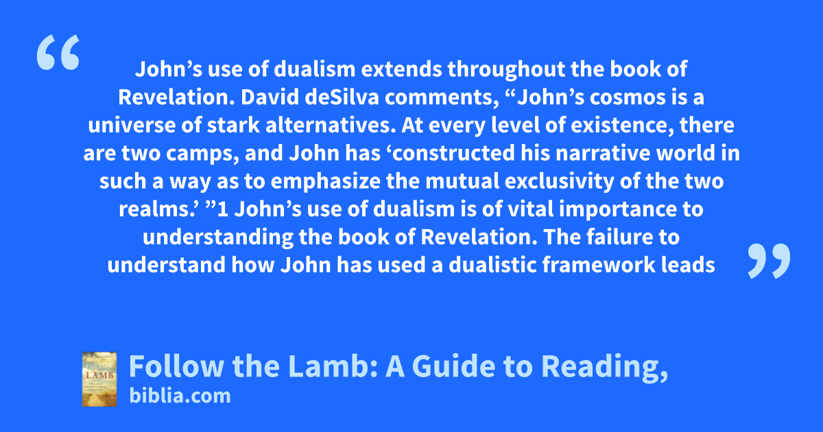 John’s use of dualism extends throughout the book of Revelation. David deSilva comments, “John’s cosmos is a universe of stark alternatives. At every level of existence, there are two camps, and John has ‘constructed his narrative world in such a way as to emphasize the mutual exclusivity of the two realms.’ ”1 John’s use of dualism is of vital importance to understanding the book of Revelation. The failure to understand how John has used a dualistic framework leads