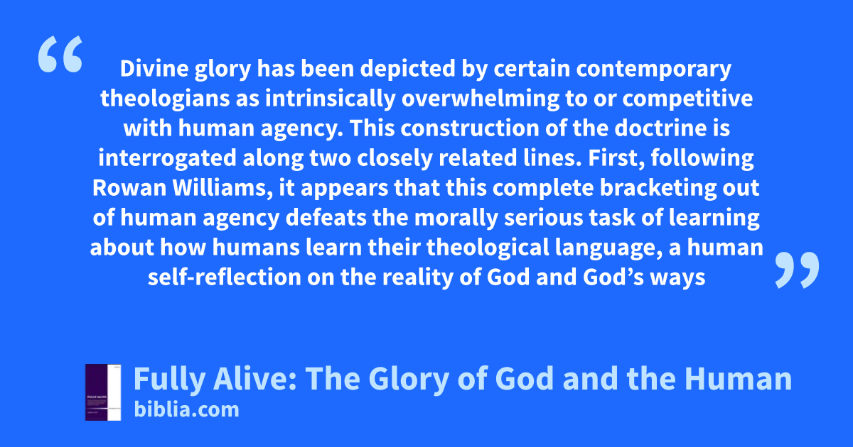 Numerous contemporary theologians depict divine glory as overwhelming to or competitive with human agency. In effect, this makes humanity a threat to God’s glory, and causes God’s glory to remain opaque to human enquiry and foreign to human life. Karl Barth and Hans Urs von Balthasar have avoided this tendency, instead depicting God’s glory as enabling people to participate in glorifying God....