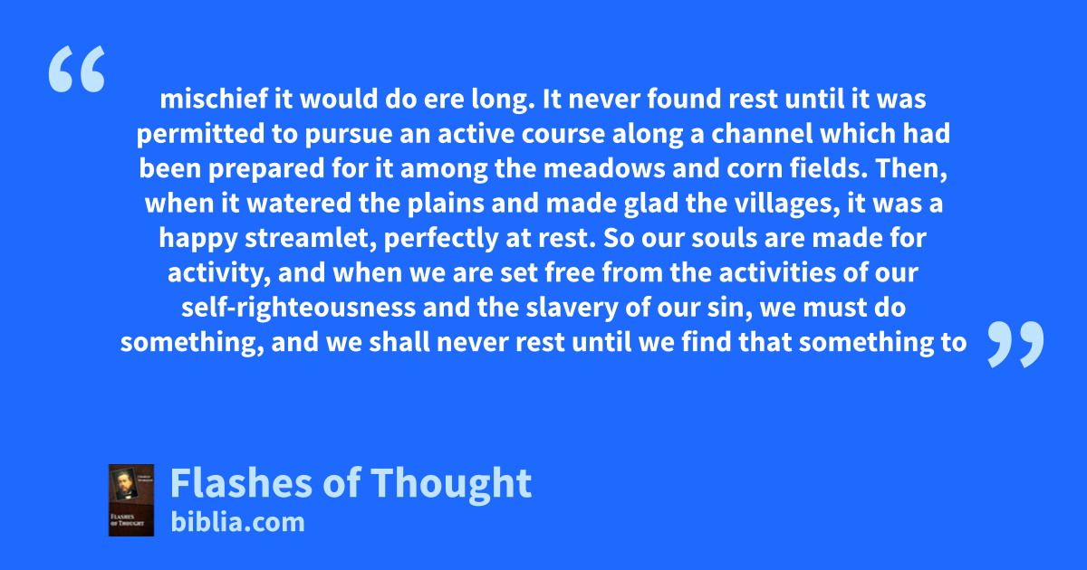 mischief it would do ere long. It never found rest until it was permitted to pursue an active course along a channel which had been prepared for it among the meadows and corn fields. Then, when it watered the plains and made glad the villages, it was a happy streamlet, perfectly at rest. So our souls are made for activity, and when we are set free from the activities of our self-righteousness and the slavery of our sin, we must do something, and we shall never rest until we find that something to