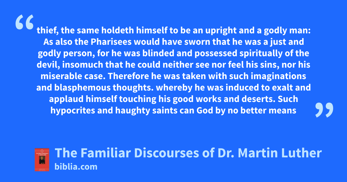 thief, the same holdeth himself to be an upright and a godly man: As also the Pharisees would have sworn that he was a just and godly person, for he was blinded and possessed spiritually of the devil, insomuch that he could neither see nor feel his sins, nor his miserable case. Therefore he was taken with such imaginations and blasphemous thoughts. whereby he was induced to exalt and applaud himself touching his good works and deserts. Such hypocrites and haughty saints can God by no better means