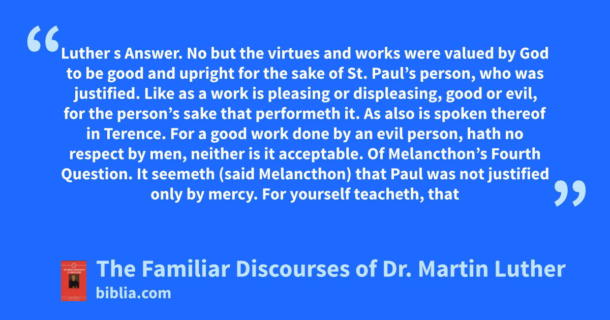 Luther s Answer. No but the virtues and works were valued by God to be good and upright for the sake of St. Paul’s person, who was justified. Like as a work is pleasing or displeasing, good or evil, for the person’s sake that performeth it. As also is spoken thereof in Terence. For a good work done by an evil person, hath no respect by men, neither is it acceptable. Of Melancthon’s Fourth Question. It seemeth (said Melancthon) that Paul was not justified only by mercy. For yourself teacheth, that