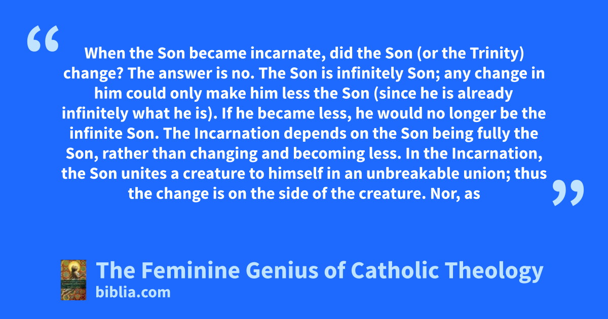 When the Son became incarnate, did the Son (or the Trinity) change? The answer is no. The Son is infinitely Son; any change in him could only make him less the Son (since he is already infinitely what he is). If he became less, he would no longer be the infinite Son. The Incarnation depends on the Son being fully the Son, rather than changing and becoming less. In the Incarnation, the Son unites a creature to himself in an unbreakable union; thus the change is on the side of the creature. Nor, as