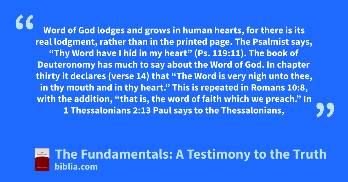 Word of God lodges and grows in human hearts, for there is its real lodgment, rather than in the printed page. The Psalmist says, “Thy Word have I hid in my heart” (Ps. 119:11). The book of Deuteronomy has much to say about the Word of God. In chapter thirty it declares (verse 14) that “The Word is very nigh unto thee, in thy mouth and in thy heart.” This is repeated in Romans 10:8, with the addition, “that is, the word of faith which we preach.” In 1 Thessalonians 2:13 Paul says to the Thessalonians,