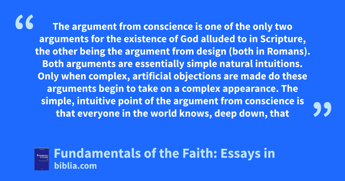 The argument from conscience is one of the only two arguments for the existence of God alluded to in Scripture, the other being the argument from design (both in Romans). Both arguments are essentially simple natural intuitions. Only when complex, artificial objections are made do these arguments begin to take on a complex appearance. The simple, intuitive point of the argument from conscience is that everyone in the world knows, deep down, that