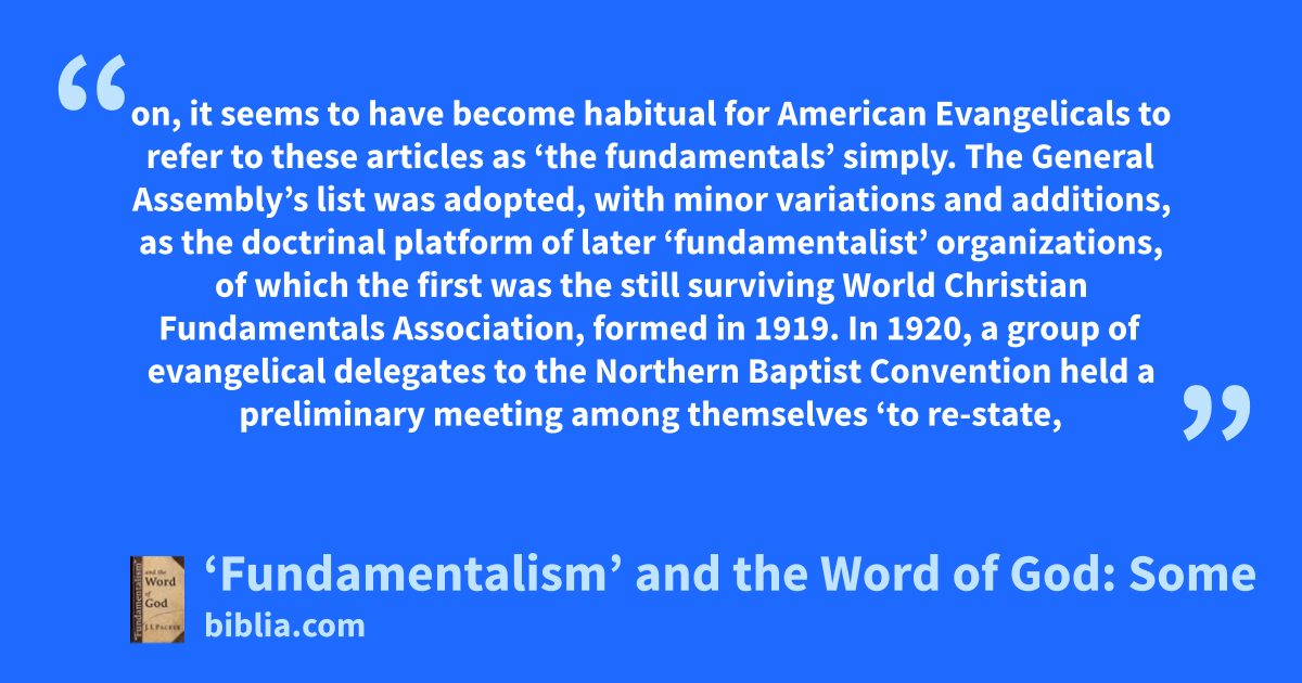 on, it seems to have become habitual for American Evangelicals to refer to these articles as ‘the fundamentals’ simply. The General Assembly’s list was adopted, with minor variations and additions, as the doctrinal platform of later ‘fundamentalist’ organizations, of which the first was the still surviving World Christian Fundamentals Association, formed in 1919. In 1920, a group of evangelical delegates to the Northern Baptist Convention held a preliminary meeting among themselves ‘to re-state,