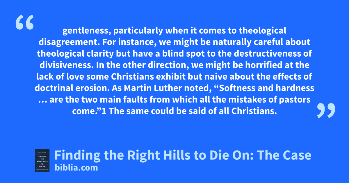 gentleness, particularly when it comes to theological disagreement. For instance, we might be naturally careful about theological clarity but have a blind spot to the destructiveness of divisiveness. In the other direction, we might be horrified at the lack of love some Christians exhibit but naive about the effects of doctrinal erosion. As Martin Luther noted, “Softness and hardness … are the two main faults from which all the mistakes of pastors come.”1 The same could be said of all Christians.