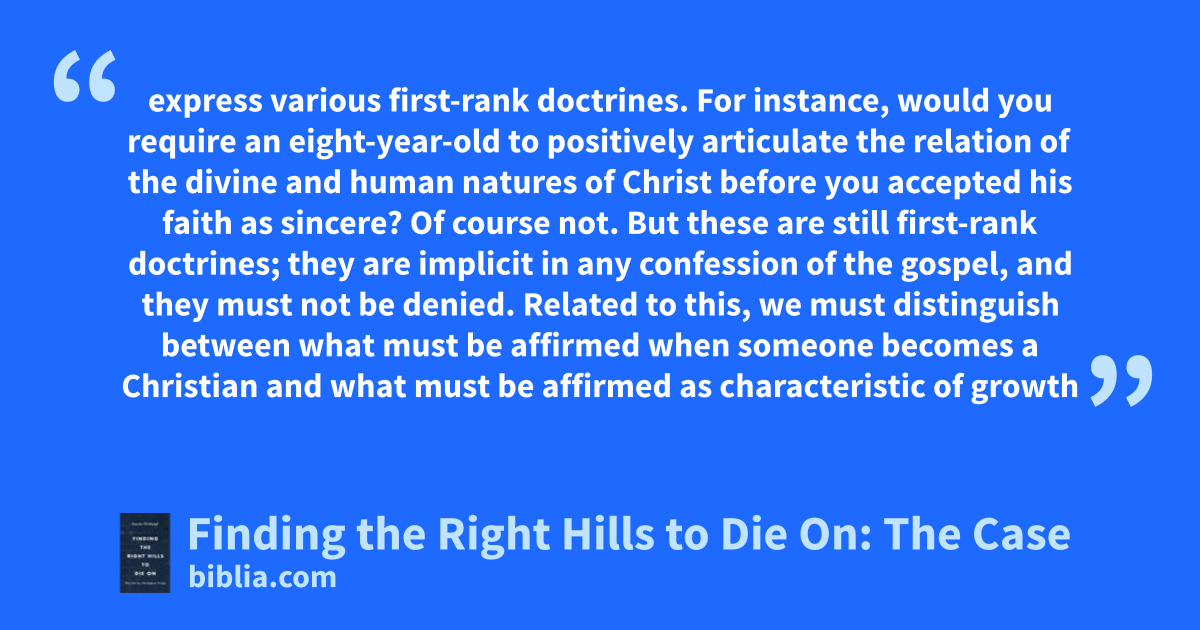 express various first-rank doctrines. For instance, would you require an eight-year-old to positively articulate the relation of the divine and human natures of Christ before you accepted his faith as sincere? Of course not. But these are still first-rank doctrines; they are implicit in any confession of the gospel, and they must not be denied. Related to this, we must distinguish between what must be affirmed when someone becomes a Christian and what must be affirmed as characteristic of growth