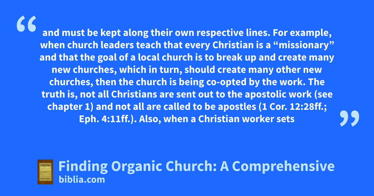 and must be kept along their own respective lines. For example, when church leaders teach that every Christian is a “missionary” and that the goal of a local church is to break up and create many new churches, which in turn, should create many other new churches, then the church is being co-opted by the work. The truth is, not all Christians are sent out to the apostolic work (see chapter 1) and not all are called to be apostles (1 Cor. 12:28ff.; Eph. 4:11ff.). Also, when a Christian worker sets