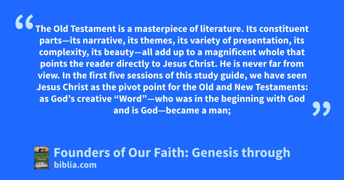 The Old Testament is a masterpiece of literature. Its constituent parts—its narrative, its themes, its variety of presentation, its complexity, its beauty—all add up to a magnificent whole that points the reader directly to Jesus Christ. He is never far from view. In the first five sessions of this study guide, we have seen Jesus Christ as the pivot point for the Old and New Testaments: as God’s creative “Word”—who was in the beginning with God and is God—became a man;