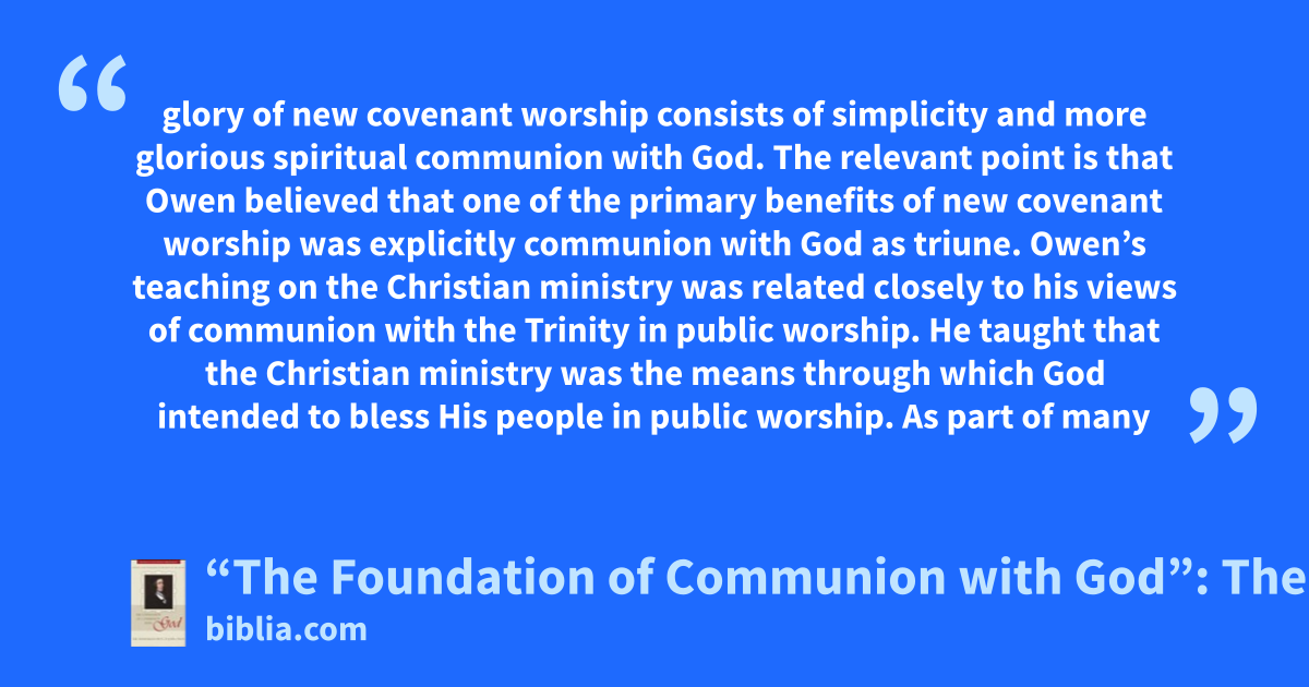 glory of new covenant worship consists of simplicity and more glorious spiritual communion with God. The relevant point is that Owen believed that one of the primary benefits of new covenant worship was explicitly communion with God as triune. Owen’s teaching on the Christian ministry was related closely to his views of communion with the Trinity in public worship. He taught that the Christian ministry was the means through which God intended to bless His people in public worship. As part of many