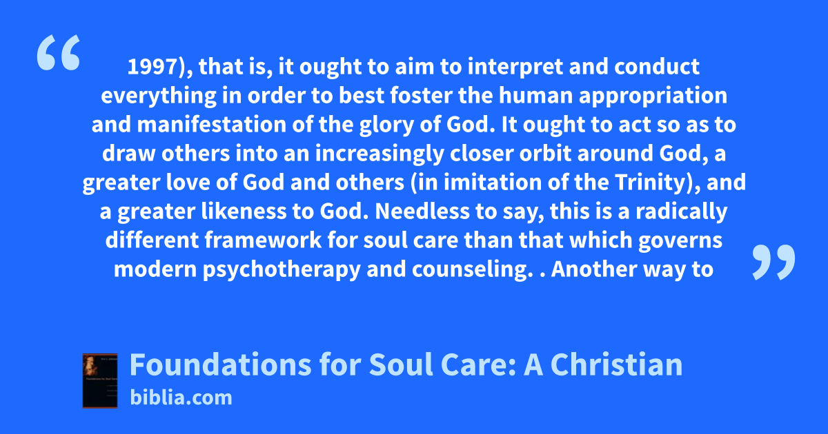 1997), that is, it ought to aim to interpret and conduct everything in order to best foster the human appropriation and manifestation of the glory of God. It ought to act so as to draw others into an increasingly closer orbit around God, a greater love of God and others (in imitation of the Trinity), and a greater likeness to God. Needless to say, this is a radically different framework for soul care than that which governs modern psychotherapy and counseling. . Another way to