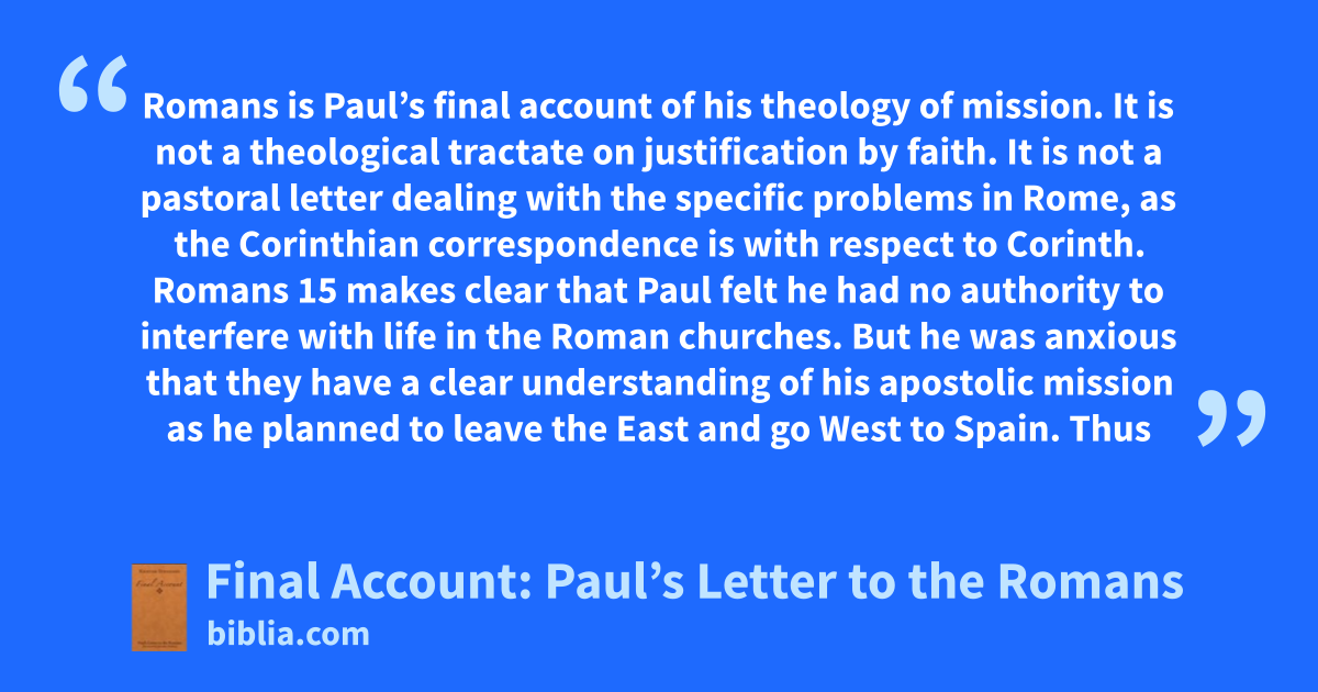Romans is Paul’s final account of his theology of mission. It is not a theological tractate on justification by faith. It is not a pastoral letter dealing with the specific problems in Rome, as the Corinthian correspondence is with respect to Corinth. Romans 15 makes clear that Paul felt he had no authority to interfere with life in the Roman churches. But he was anxious that they have a clear understanding of his apostolic mission as he planned to leave the East and go West to Spain. Thus