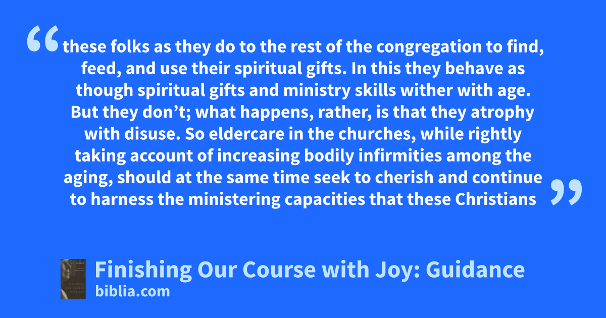 these folks as they do to the rest of the congregation to find, feed, and use their spiritual gifts. In this they behave as though spiritual gifts and ministry skills wither with age. But they don’t; what happens, rather, is that they atrophy with disuse. So eldercare in the churches, while rightly taking account of increasing bodily infirmities among the aging, should at the same time seek to cherish and continue to harness the ministering capacities that these Christians