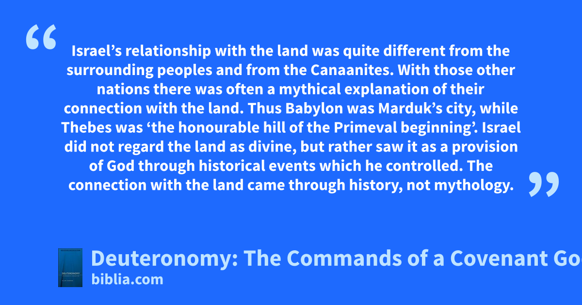 Israel’s relationship with the land was quite different from the surrounding peoples and from the Canaanites. With those other nations there was often a mythical explanation of their connection with the land. Thus Babylon was Marduk’s city, while Thebes was ‘the honourable hill of the Primeval beginning’. Israel did not regard the land as divine, but rather saw it as a provision of God through historical events which he controlled. The connection with the land came through history, not mythology.