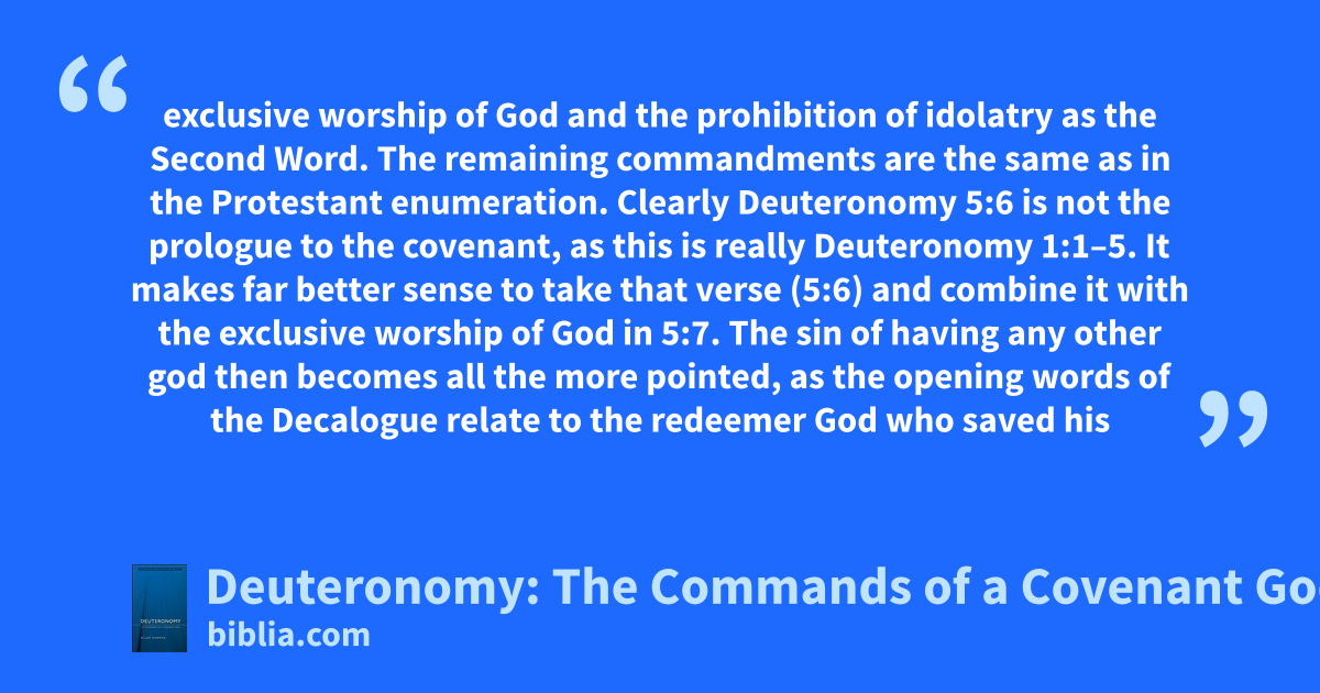 exclusive worship of God and the prohibition of idolatry as the Second Word. The remaining commandments are the same as in the Protestant enumeration. Clearly Deuteronomy 5:6 is not the prologue to the covenant, as this is really Deuteronomy 1:1–5. It makes far better sense to take that verse (5:6) and combine it with the exclusive worship of God in 5:7. The sin of having any other god then becomes all the more pointed, as the opening words of the Decalogue relate to the redeemer God who saved his