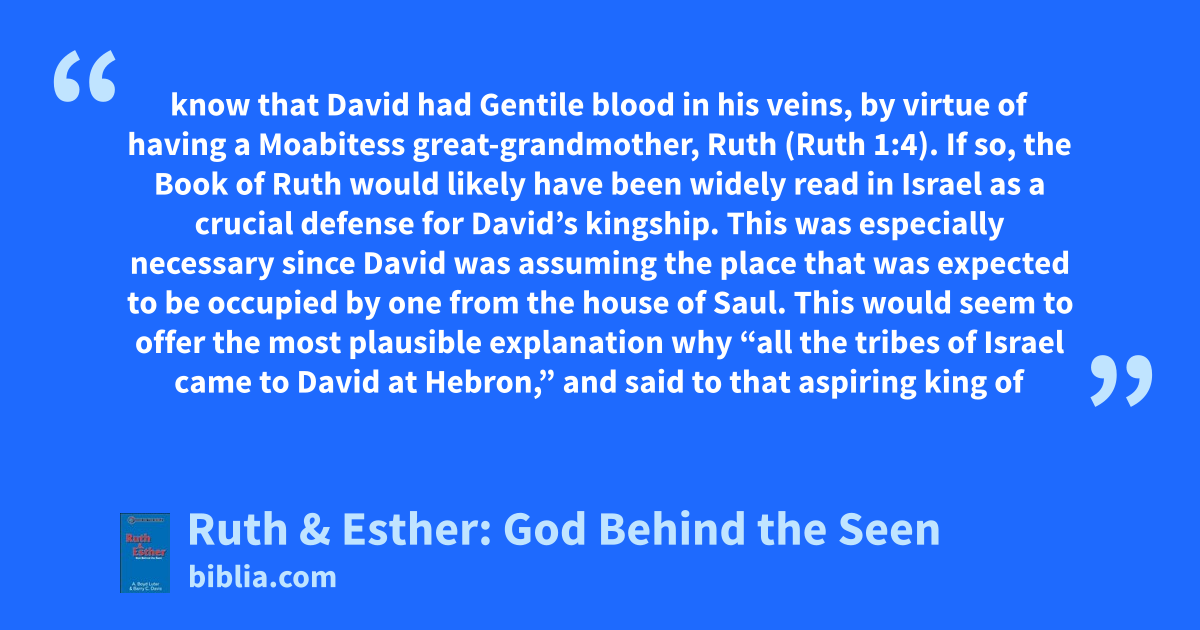 know that David had Gentile blood in his veins, by virtue of having a Moabitess great-grandmother, Ruth (Ruth 1:4). If so, the Book of Ruth would likely have been widely read in Israel as a crucial defense for David’s kingship. This was especially necessary since David was assuming the place that was expected to be occupied by one from the house of Saul. This would seem to offer the most plausible explanation why “all the tribes of Israel came to David at Hebron,” and said to that aspiring king of