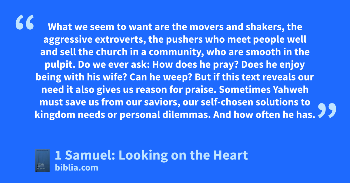 What we seem to want are the movers and shakers, the aggressive extroverts, the pushers who meet people well and sell the church in a community, who are smooth in the pulpit. Do we ever ask: How does he pray? Does he enjoy being with his wife? Can he weep? But if this text reveals our need it also gives us reason for praise. Sometimes Yahweh must save us from our saviors, our self-chosen solutions to kingdom needs or personal dilemmas. And how often he has.