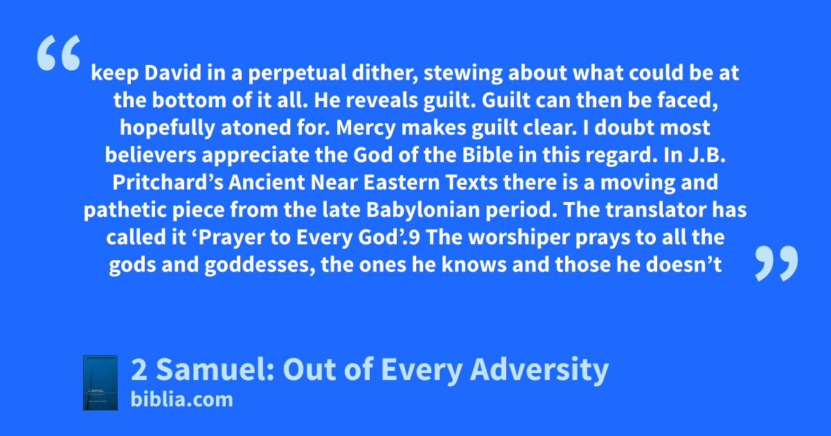 keep David in a perpetual dither, stewing about what could be at the bottom of it all. He reveals guilt. Guilt can then be faced, hopefully atoned for. Mercy makes guilt clear. I doubt most believers appreciate the God of the Bible in this regard. In J.B. Pritchard’s Ancient Near Eastern Texts there is a moving and pathetic piece from the late Babylonian period. The translator has called it ‘Prayer to Every God’.9 The worshiper prays to all the gods and goddesses, the ones he knows and those he doesn’t
