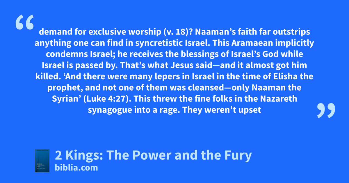 demand for exclusive worship (v. 18)? Naaman’s faith far outstrips anything one can find in syncretistic Israel. This Aramaean implicitly condemns Israel; he receives the blessings of Israel’s God while Israel is passed by. That’s what Jesus said—and it almost got him killed. ‘And there were many lepers in Israel in the time of Elisha the prophet, and not one of them was cleansed—only Naaman the Syrian’ (Luke 4:27). This threw the fine folks in the Nazareth synagogue into a rage. They weren’t upset