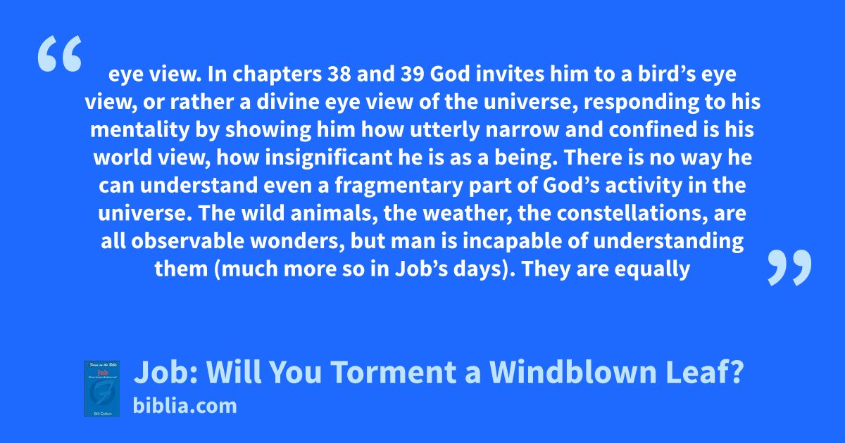 eye view. In chapters 38 and 39 God invites him to a bird’s eye view, or rather a divine eye view of the universe, responding to his mentality by showing him how utterly narrow and confined is his world view, how insignificant he is as a being. There is no way he can understand even a fragmentary part of God’s activity in the universe. The wild animals, the weather, the constellations, are all observable wonders, but man is incapable of understanding them (much more so in Job’s days). They are equally