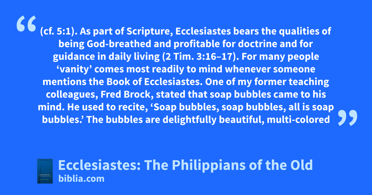 (cf. 5:1). As part of Scripture, Ecclesiastes bears the qualities of being God-breathed and profitable for doctrine and for guidance in daily living (2 Tim. 3:16–17). For many people ‘vanity’ comes most readily to mind whenever someone mentions the Book of Ecclesiastes. One of my former teaching colleagues, Fred Brock, stated that soap bubbles came to his mind. He used to recite, ‘Soap bubbles, soap bubbles, all is soap bubbles.’ The bubbles are delightfully beautiful, multi-colored
