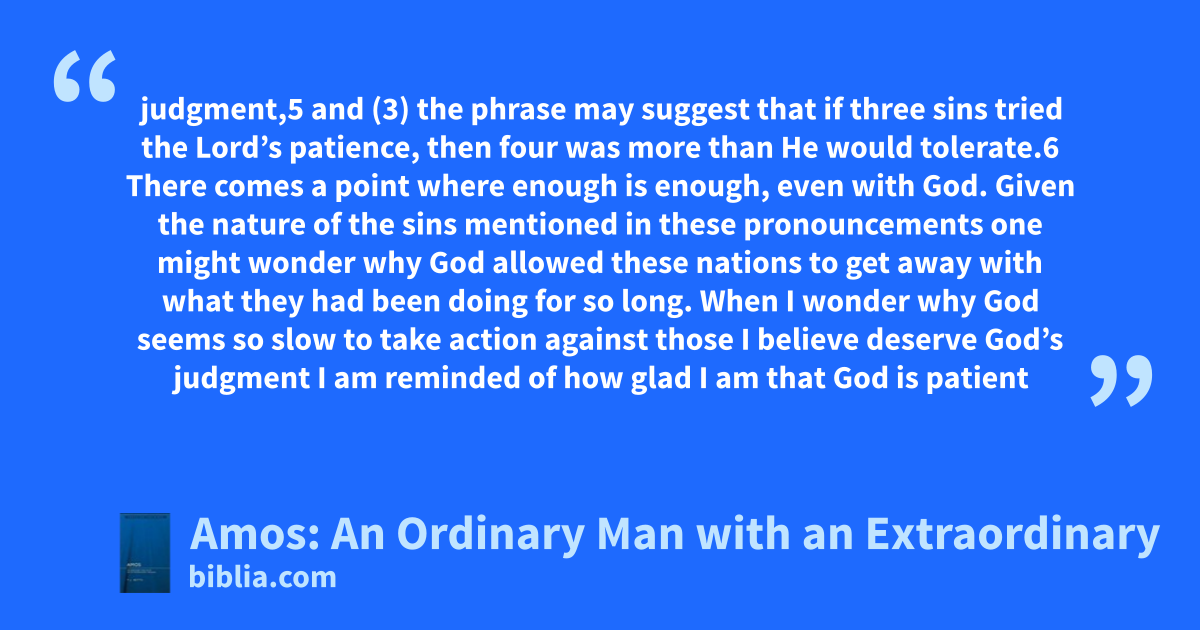 judgment,5 and (3) the phrase may suggest that if three sins tried the Lord’s patience, then four was more than He would tolerate.6 There comes a point where enough is enough, even with God. Given the nature of the sins mentioned in these pronouncements one might wonder why God allowed these nations to get away with what they had been doing for so long. When I wonder why God seems so slow to take action against those I believe deserve God’s judgment I am reminded of how glad I am that God is patient