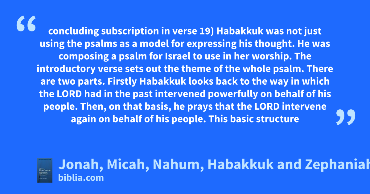 concluding subscription in verse 19) Habakkuk was not just using the psalms as a model for expressing his thought. He was composing a psalm for Israel to use in her worship. The introductory verse sets out the theme of the whole psalm. There are two parts. Firstly Habakkuk looks back to the way in which the LORD had in the past intervened powerfully on behalf of his people. Then, on that basis, he prays that the LORD intervene again on behalf of his people. This basic structure