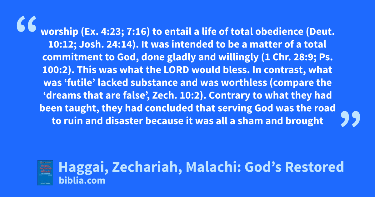 worship (Ex. 4:23; 7:16) to entail a life of total obedience (Deut. 10:12; Josh. 24:14). It was intended to be a matter of a total commitment to God, done gladly and willingly (1 Chr. 28:9; Ps. 100:2). This was what the LORD would bless. In contrast, what was ‘futile’ lacked substance and was worthless (compare the ‘dreams that are false’, Zech. 10:2). Contrary to what they had been taught, they had concluded that serving God was the road to ruin and disaster because it was all a sham and brought
