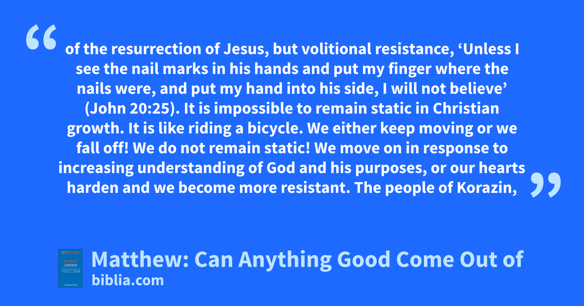 of the resurrection of Jesus, but volitional resistance, ‘Unless I see the nail marks in his hands and put my finger where the nails were, and put my hand into his side, I will not believe’ (John 20:25). It is impossible to remain static in Christian growth. It is like riding a bicycle. We either keep moving or we fall off! We do not remain static! We move on in response to increasing understanding of God and his purposes, or our hearts harden and we become more resistant. The people of Korazin,