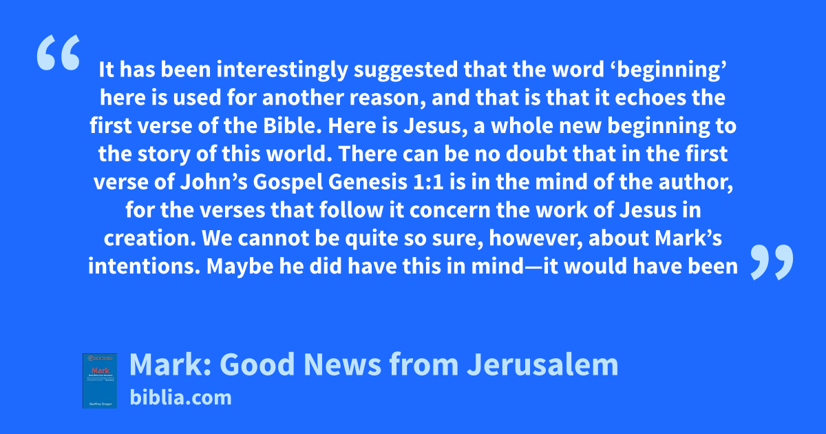 It has been interestingly suggested that the word ‘beginning’ here is used for another reason, and that is that it echoes the first verse of the Bible. Here is Jesus, a whole new beginning to the story of this world. There can be no doubt that in the first verse of John’s Gospel Genesis 1:1 is in the mind of the author, for the verses that follow it concern the work of Jesus in creation. We cannot be quite so sure, however, about Mark’s intentions. Maybe he did have this in mind—it would have been