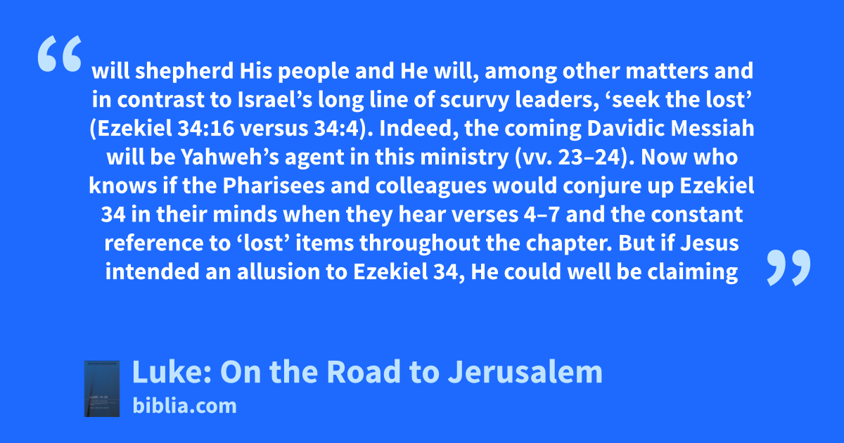 will shepherd His people and He will, among other matters and in contrast to Israel’s long line of scurvy leaders, ‘seek the lost’ (Ezekiel 34:16 versus 34:4). Indeed, the coming Davidic Messiah will be Yahweh’s agent in this ministry (vv. 23–24). Now who knows if the Pharisees and colleagues would conjure up Ezekiel 34 in their minds when they hear verses 4–7 and the constant reference to ‘lost’ items throughout the chapter. But if Jesus intended an allusion to Ezekiel 34, He could well be claiming