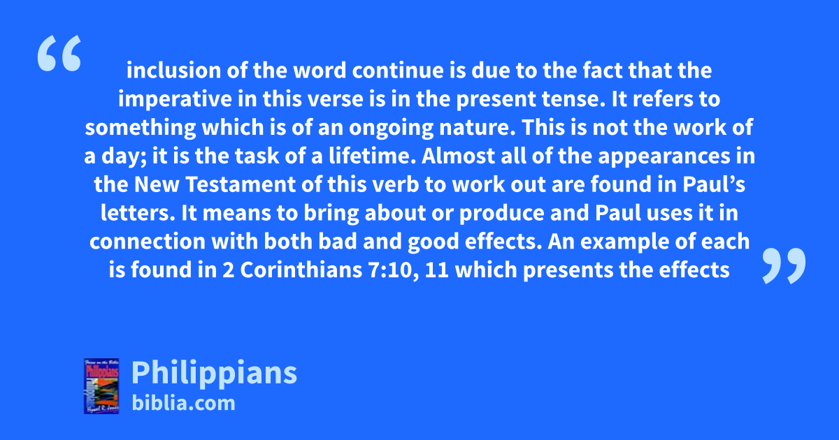inclusion of the word continue is due to the fact that the imperative in this verse is in the present tense. It refers to something which is of an ongoing nature. This is not the work of a day; it is the task of a lifetime. Almost all of the appearances in the New Testament of this verb to work out are found in Paul’s letters. It means to bring about or produce and Paul uses it in connection with both bad and good effects. An example of each is found in 2 Corinthians 7:10, 11 which presents the effects