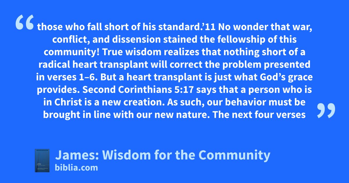 those who fall short of his standard.’11 No wonder that war, conflict, and dissension stained the fellowship of this community! True wisdom realizes that nothing short of a radical heart transplant will correct the problem presented in verses 1–6. But a heart transplant is just what God’s grace provides. Second Corinthians 5:17 says that a person who is in Christ is a new creation. As such, our behavior must be brought in line with our new nature. The next four verses