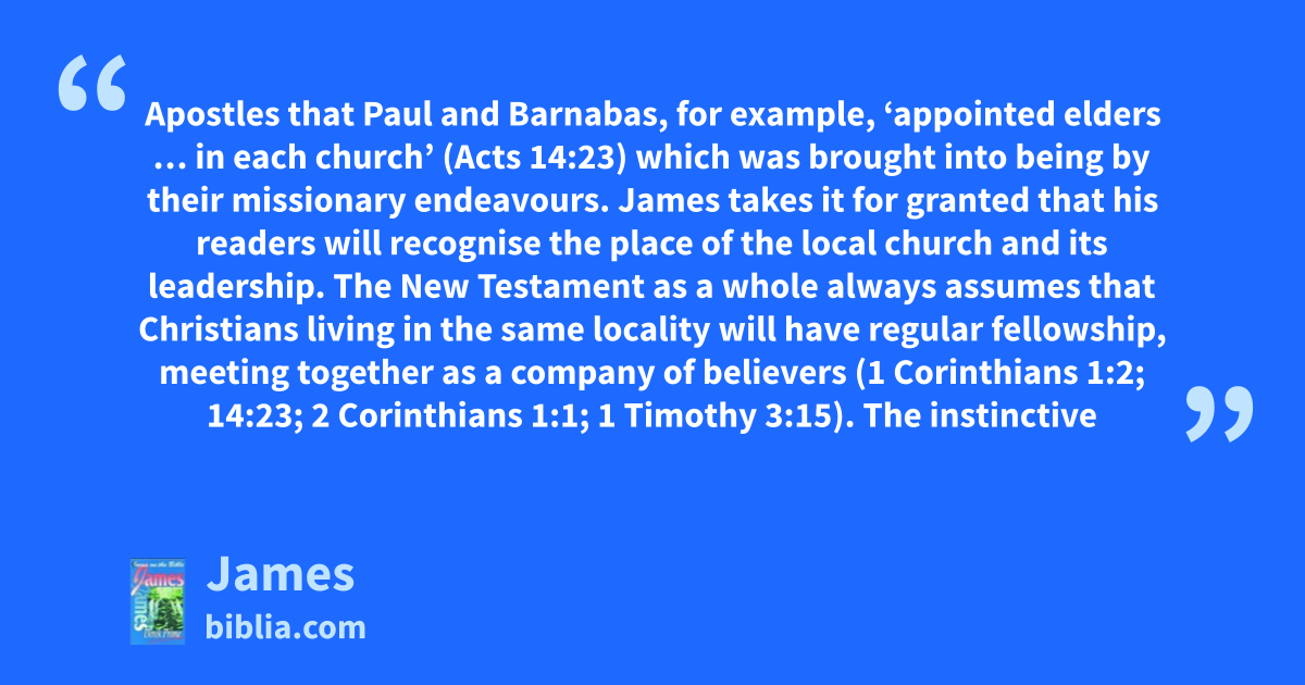 Apostles that Paul and Barnabas, for example, ‘appointed elders … in each church’ (Acts 14:23) which was brought into being by their missionary endeavours. James takes it for granted that his readers will recognise the place of the local church and its leadership. The New Testament as a whole always assumes that Christians living in the same locality will have regular fellowship, meeting together as a company of believers (1 Corinthians 1:2; 14:23; 2 Corinthians 1:1; 1 Timothy 3:15). The instinctive