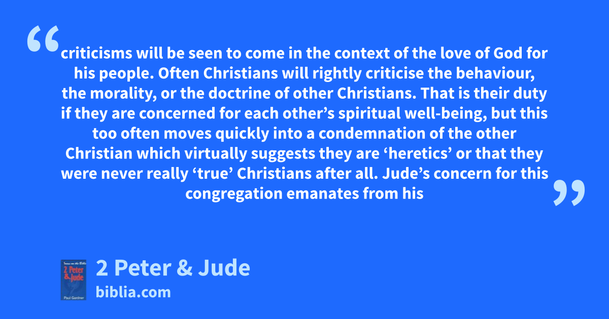 criticisms will be seen to come in the context of the love of God for his people. Often Christians will rightly criticise the behaviour, the morality, or the doctrine of other Christians. That is their duty if they are concerned for each other’s spiritual well-being, but this too often moves quickly into a condemnation of the other Christian which virtually suggests they are ‘heretics’ or that they were never really ‘true’ Christians after all. Jude’s concern for this congregation emanates from his