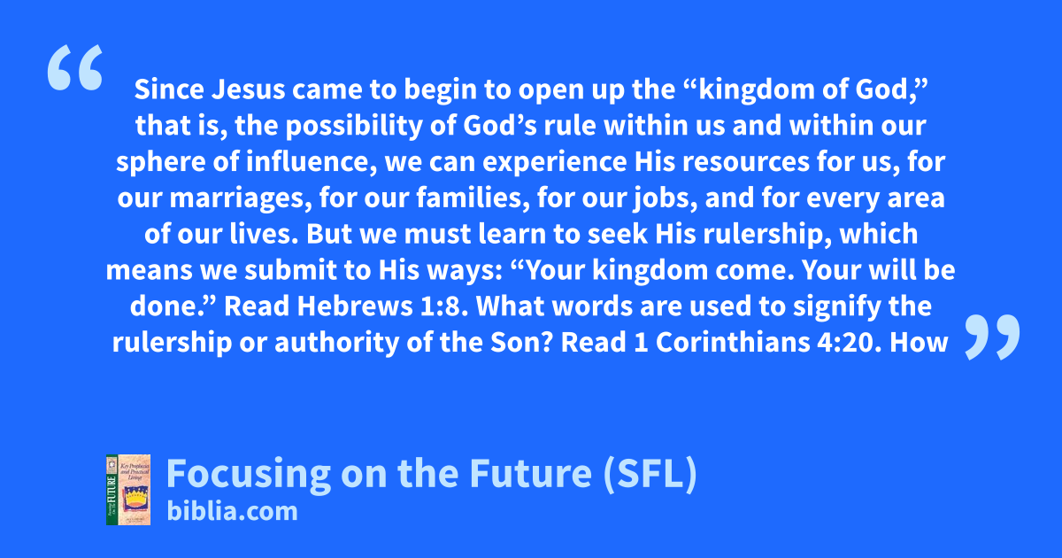 Since Jesus came to begin to open up the “kingdom of God,” that is, the possibility of God’s rule within us and within our sphere of influence, we can experience His resources for us, for our marriages, for our families, for our jobs, and for every area of our lives. But we must learn to seek His rulership, which means we submit to His ways: “Your kingdom come. Your will be done.” Read Hebrews 1:8. What words are used to signify the rulership or authority of the Son? Read 1 Corinthians 4:20. How