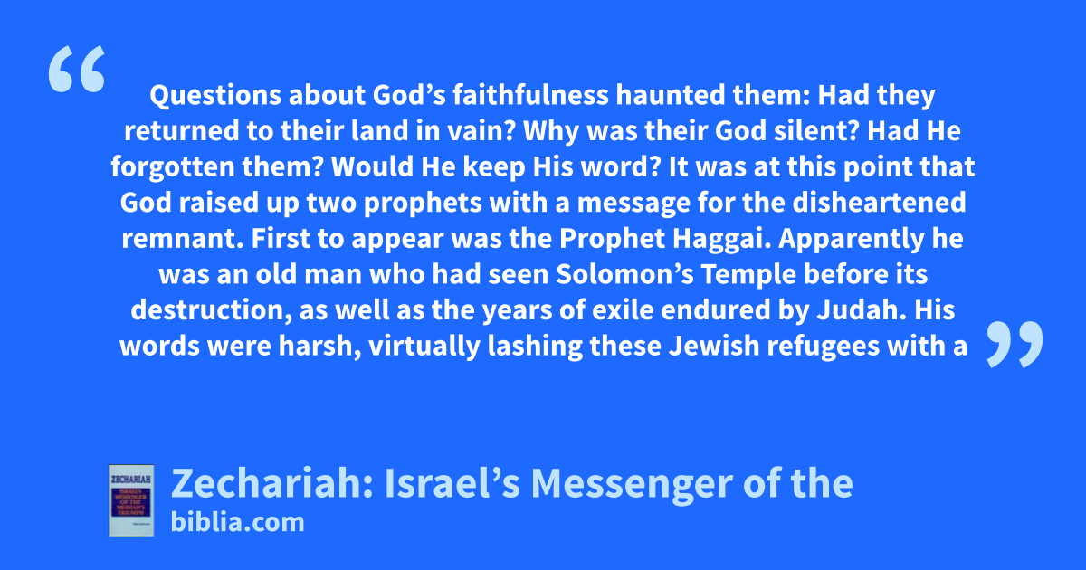 Questions about God’s faithfulness haunted them: Had they returned to their land in vain? Why was their God silent? Had He forgotten them? Would He keep His word? It was at this point that God raised up two prophets with a message for the disheartened remnant. First to appear was the Prophet Haggai. Apparently he was an old man who had seen Solomon’s Temple before its destruction, as well as the years of exile endured by Judah. His words were harsh, virtually lashing these Jewish refugees with a