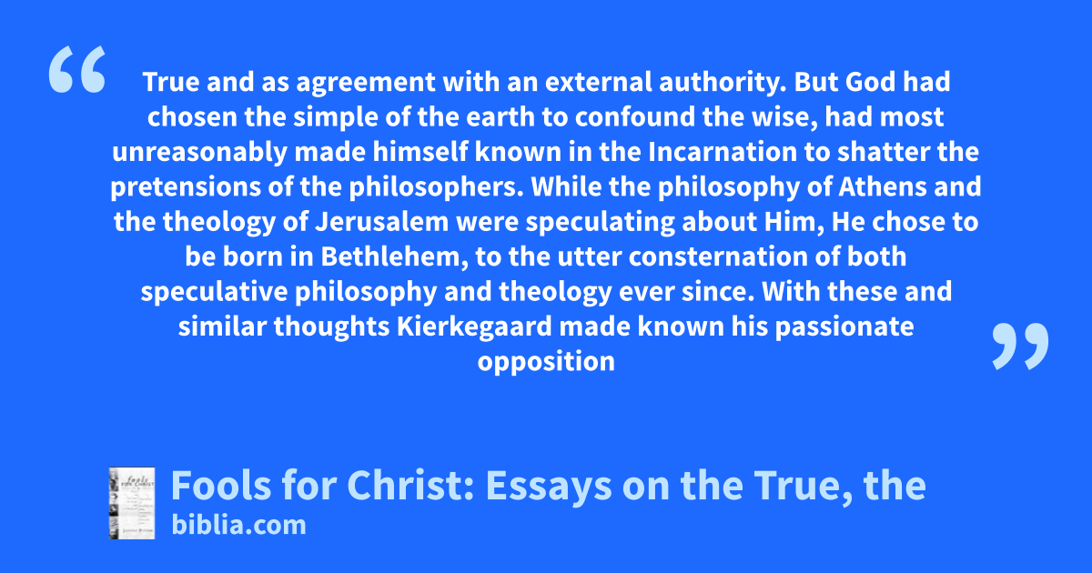 True and as agreement with an external authority. But God had chosen the simple of the earth to confound the wise, had most unreasonably made himself known in the Incarnation to shatter the pretensions of the philosophers. While the philosophy of Athens and the theology of Jerusalem were speculating about Him, He chose to be born in Bethlehem, to the utter consternation of both speculative philosophy and theology ever since. With these and similar thoughts Kierkegaard made known his passionate opposition