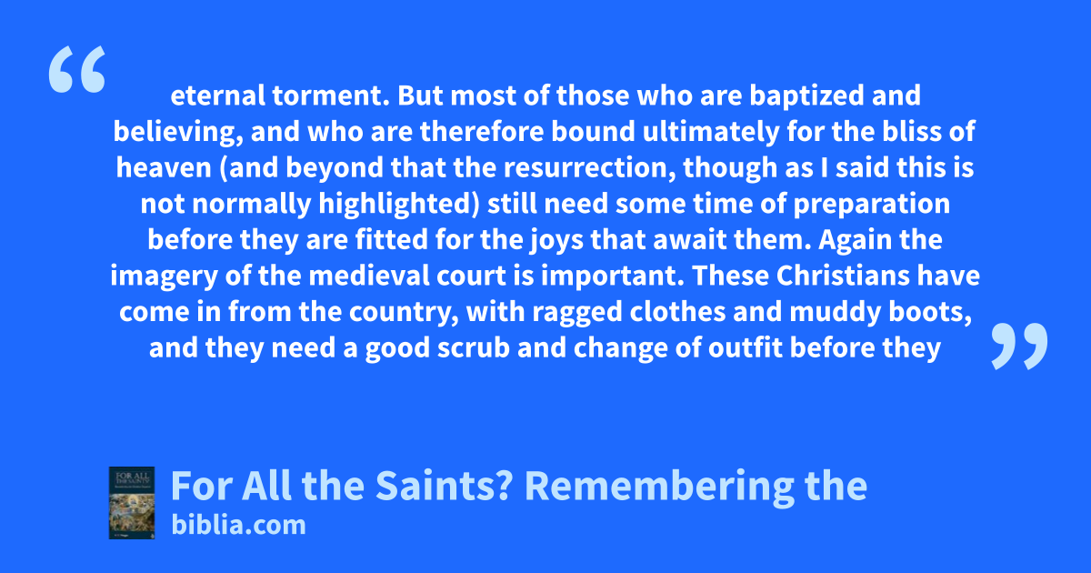 eternal torment. But most of those who are baptized and believing, and who are therefore bound ultimately for the bliss of heaven (and beyond that the resurrection, though as I said this is not normally highlighted) still need some time of preparation before they are fitted for the joys that await them. Again the imagery of the medieval court is important. These Christians have come in from the country, with ragged clothes and muddy boots, and they need a good scrub and change of outfit before they