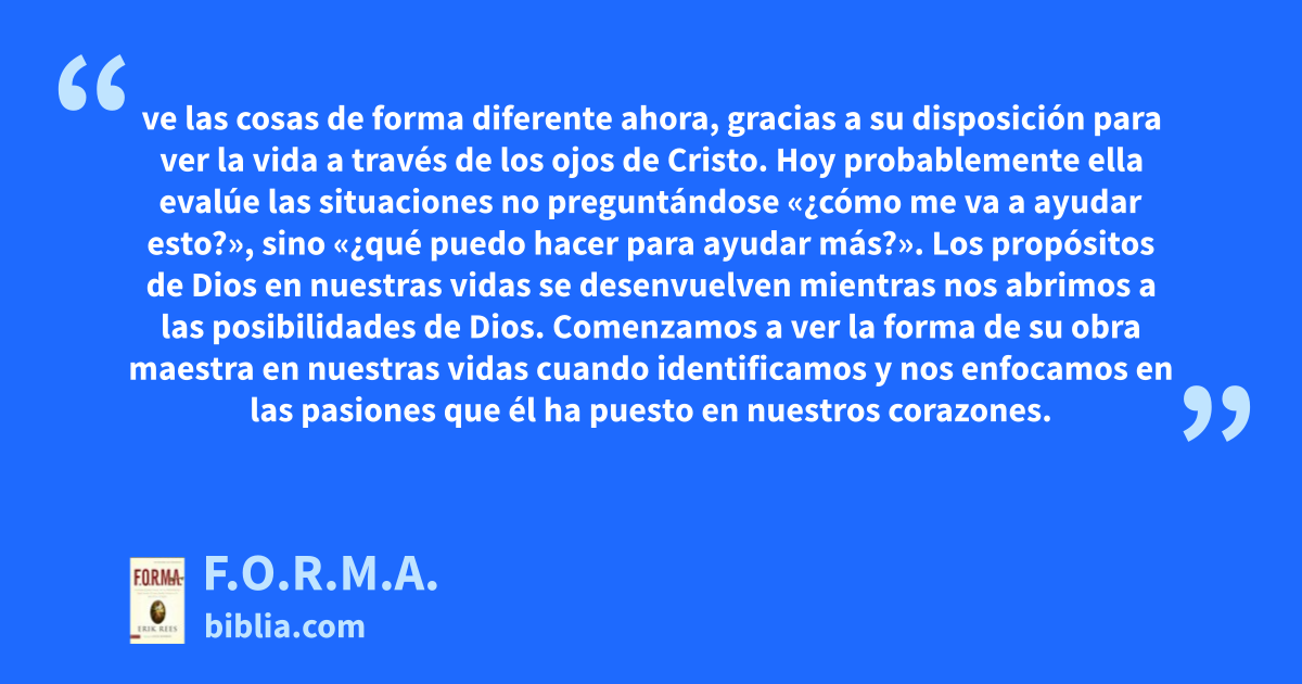 ve las cosas de forma diferente ahora, gracias a su disposición para ver la vida a través de los ojos de Cristo. Hoy probablemente ella evalúe las situaciones no preguntándose «¿cómo me va a ayudar esto?», sino «¿qué puedo hacer para ayudar más?». Los propósitos de Dios en nuestras vidas se desenvuelven mientras nos abrimos a las posibilidades de Dios. Comenzamos a ver la forma de su obra maestra en nuestras vidas cuando identificamos y nos enfocamos en las pasiones que él ha puesto en nuestros corazones.