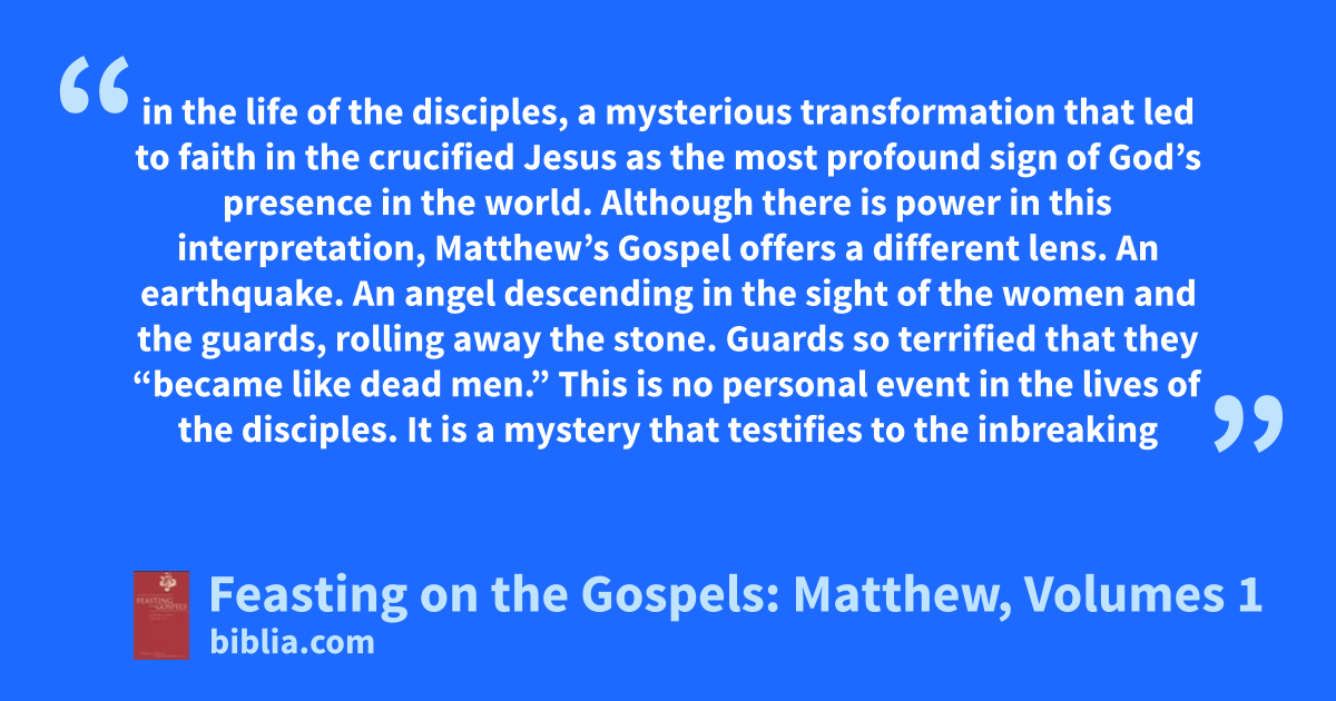 in the life of the disciples, a mysterious transformation that led to faith in the crucified Jesus as the most profound sign of God’s presence in the world. Although there is power in this interpretation, Matthew’s Gospel offers a different lens. An earthquake. An angel descending in the sight of the women and the guards, rolling away the stone. Guards so terrified that they “became like dead men.” This is no personal event in the lives of the disciples. It is a mystery that testifies to the inbreaking