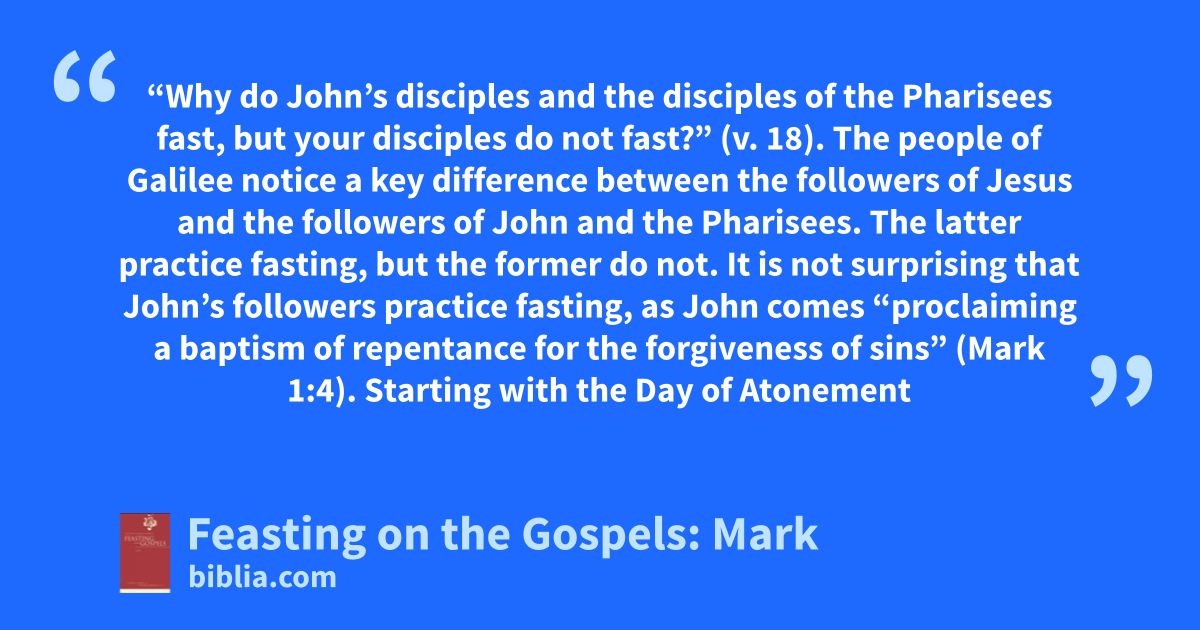 “Why do John’s disciples and the disciples of the Pharisees fast, but your disciples do not fast?” (v. 18). The people of Galilee notice a key difference between the followers of Jesus and the followers of John and the Pharisees. The latter practice fasting, but the former do not. It is not surprising that John’s followers practice fasting, as John comes “proclaiming a baptism of repentance for the forgiveness of sins” (Mark 1:4). Starting with the Day of Atonement