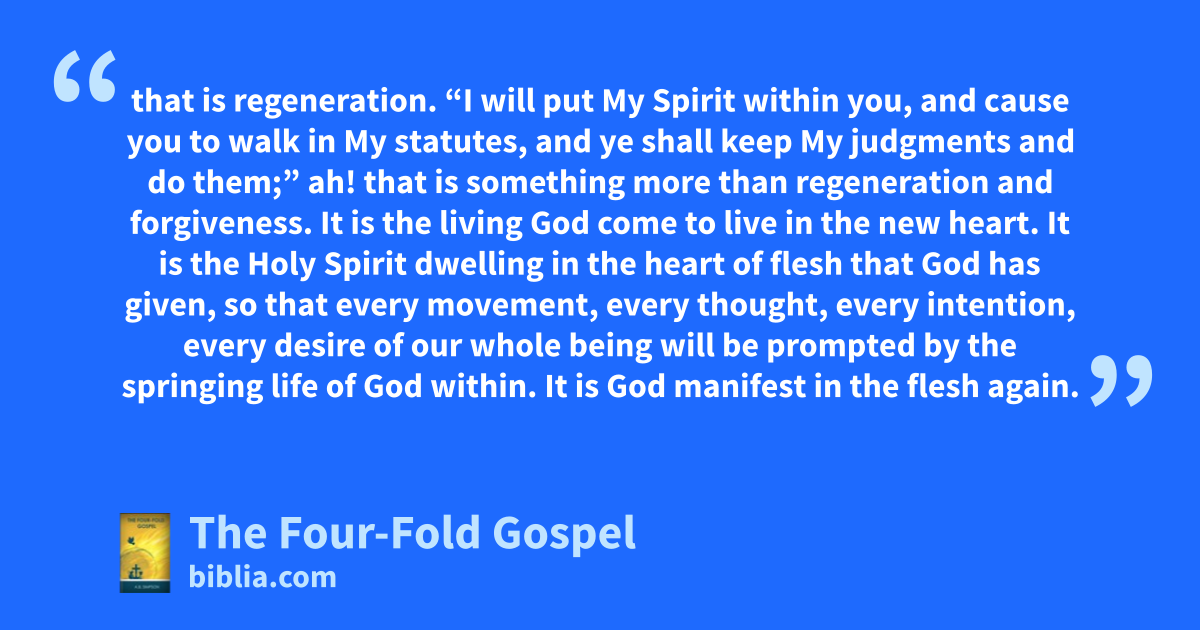 that is regeneration. “I will put My Spirit within you, and cause you to walk in My statutes, and ye shall keep My judgments and do them;” ah! that is something more than regeneration and forgiveness. It is the living God come to live in the new heart. It is the Holy Spirit dwelling in the heart of flesh that God has given, so that every movement, every thought, every intention, every desire of our whole being will be prompted by the springing life of God within. It is God manifest in the flesh again.
