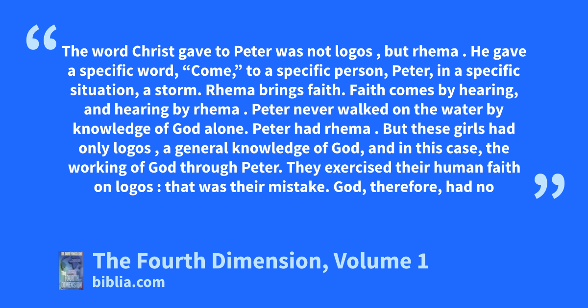The word Christ gave to Peter was not logos , but rhema . He gave a specific word, “Come,” to a specific person, Peter, in a specific situation, a storm. Rhema brings faith. Faith comes by hearing, and hearing by rhema . Peter never walked on the water by knowledge of God alone. Peter had rhema . But these girls had only logos , a general knowledge of God, and in this case, the working of God through Peter. They exercised their human faith on logos : that was their mistake. God, therefore, had no